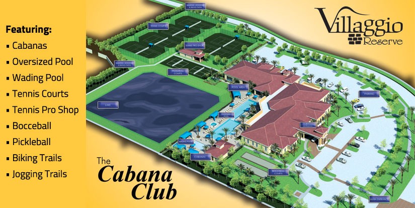 Social life at Villaggio Reserve revolves around the Cabana Club, a luxurious gathering place for residents. Within the Cabana Club is an indoor/outdoor café where delicious food is served by our master chefs, a grand ballroom and theater room, and assorted game rooms for cards, billiards, and arts and crafts. There is never a lack of activities to participate in at Villaggio Reserve.